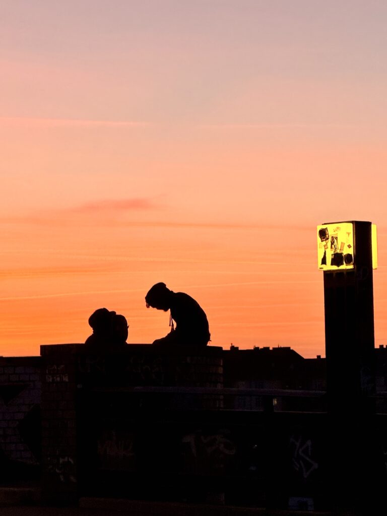 Sonnenuntergangsbrückengespräch. Heiter.