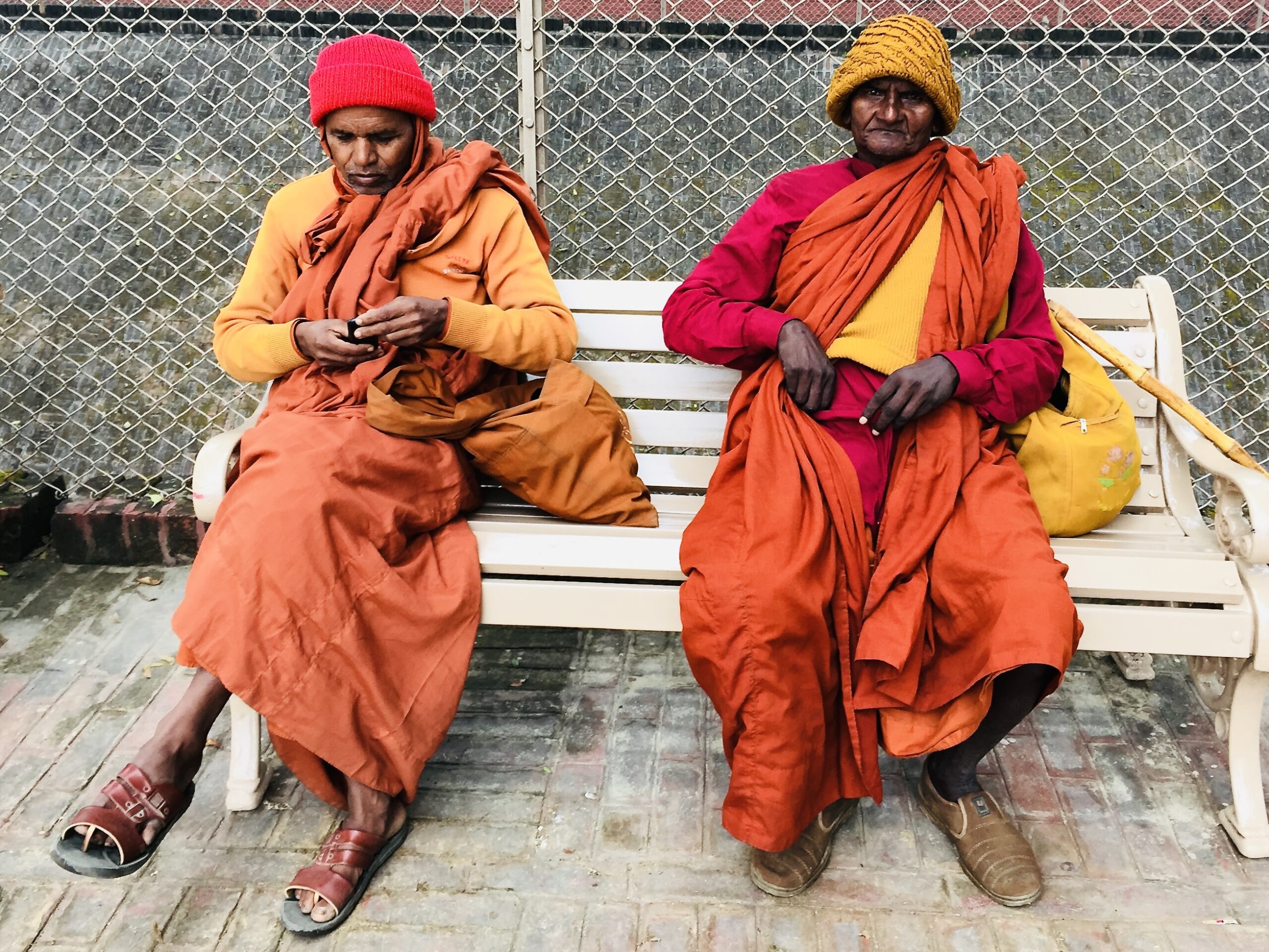 Auf einmal saßen sie auf der weißen Bank. Wanderer, Pilger, Suchende? Telefonierend der eine, mich ansehend, der andere. Einen Augenblick nur. Ein Bild.